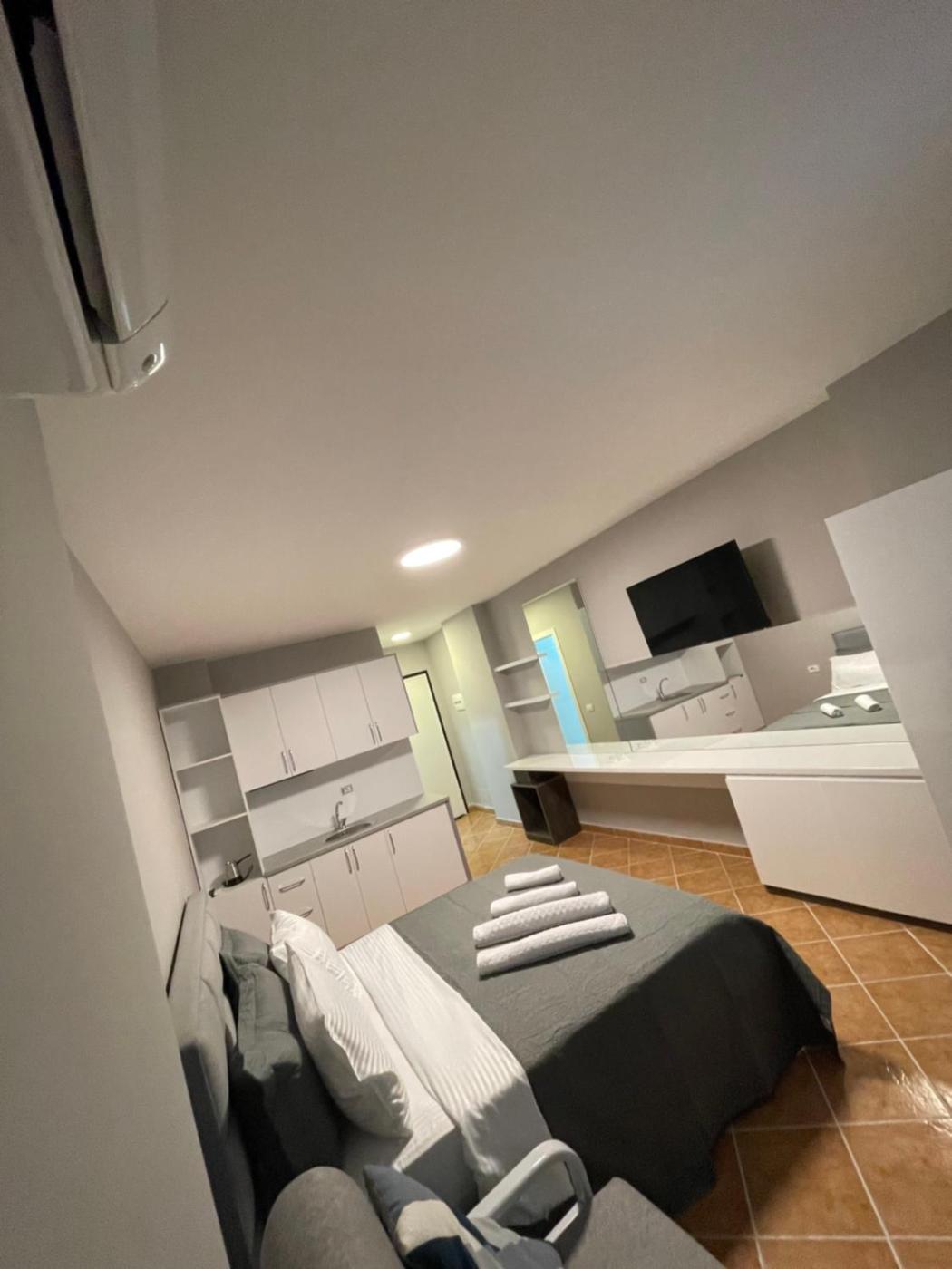 Studio Apartment with One Double Bed. The air-conditioned apartment has 1 bedroom and 1 bathroom with a shower and a hairdryer. Guests can make meals in the kitchenette that features a stovetop, a refrigerator and kitchenware. The apartment features a flat-screen TV with cable channels, a tea and coffee maker, a dining area, a wardrobe as well as sea views. The unit has 3 beds. ;